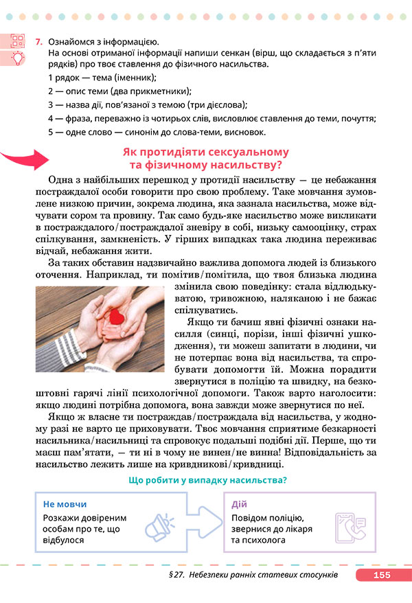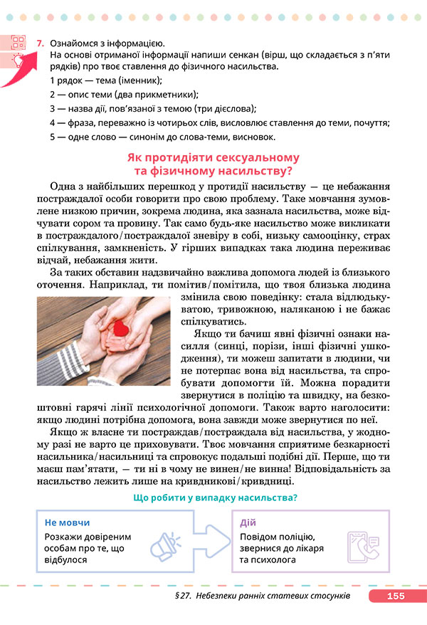 — Виконайте завдання 7 на сторінці 155 підручника. Напишіть сенкан про ставлення до фізичного насильства за опрацьованою в презентації інформацією. Відтак зачитайте сенкан класу.