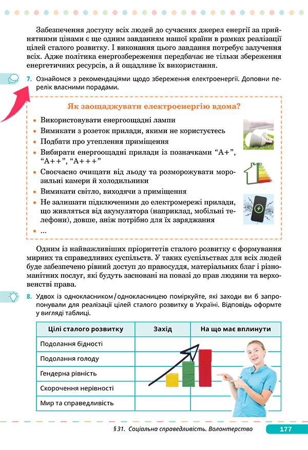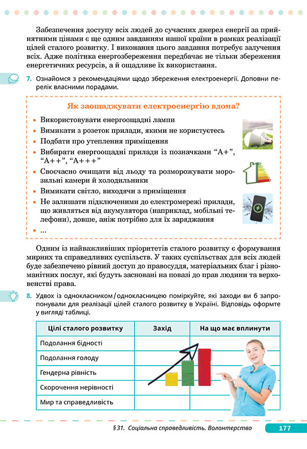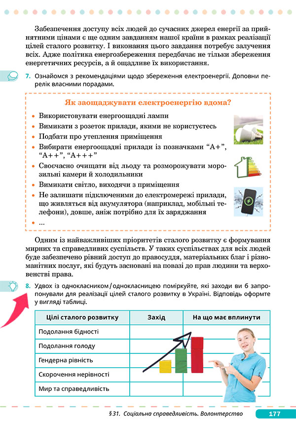 Виконайте завдання 8 на сторінці 177 підручника. Удвох із однокласником / однокласницею поміркуйте, які заходи ви б запропонували для реалізації Цілей сталого розвитку в Україні. Відповідь оформте у вигляді таблиці.