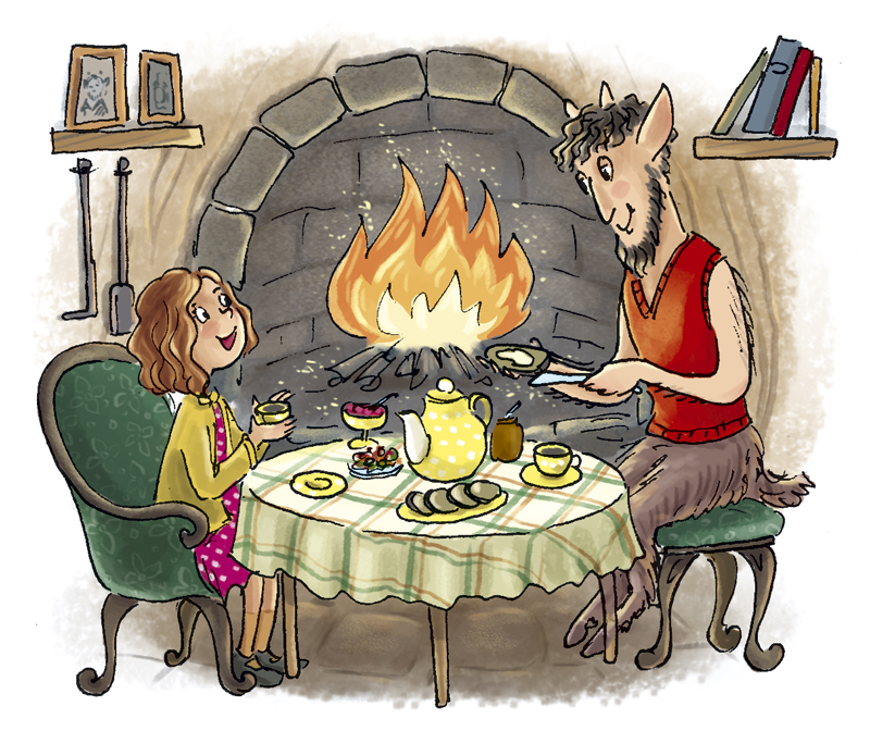 Печера, куди привів її фавн, була невелика, охайна і дуже затишна. Доки фавн збирав на стіл, Люсі розглядала книжки на поличці: “Нíмфи, їхній побут і звичаї”, “Людина: вигадка чи реальність?”.