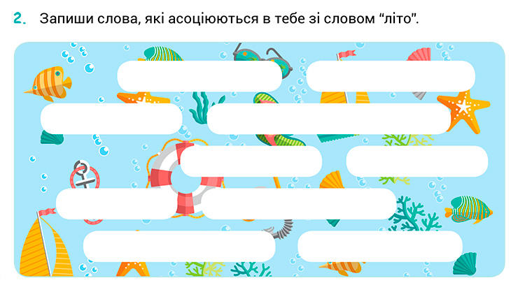 Запиши слова, які асоціюються в тебе зі словом "літо". Виконай це завдання в робочому зошиті. |