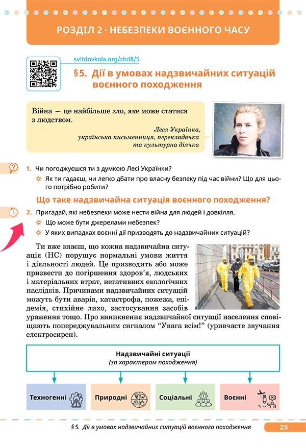 — Виконайте завдання 2 на сторінці 25 підручника. Пригадайте, які небезпеки може нести війна для людей і довкілля.