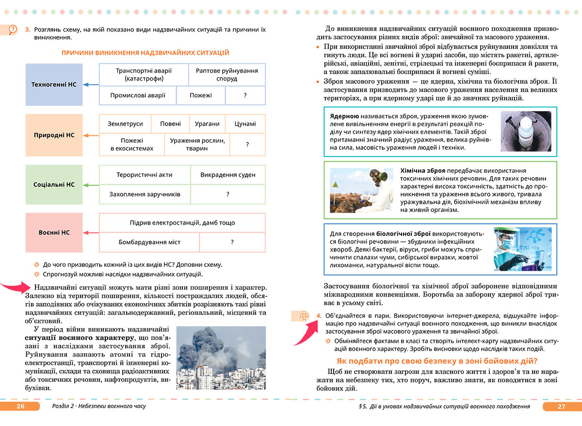 — Прочитайте текст на сторінках 26-27 підручника. Виконайте завдання 4 на сторінці 27 підручника. Використовуючи інтернет-джерела, знайдіть інформацію про надзвичайні ситуації воєнного походження, що виникли внаслідок застосування зброї масового ураження та звичайної зброї, з погляду всесвітньої небезпеки.