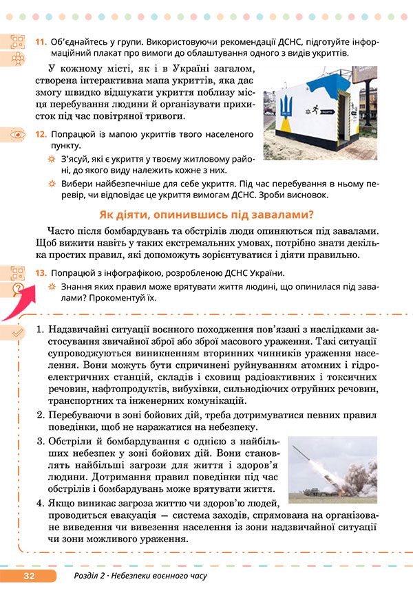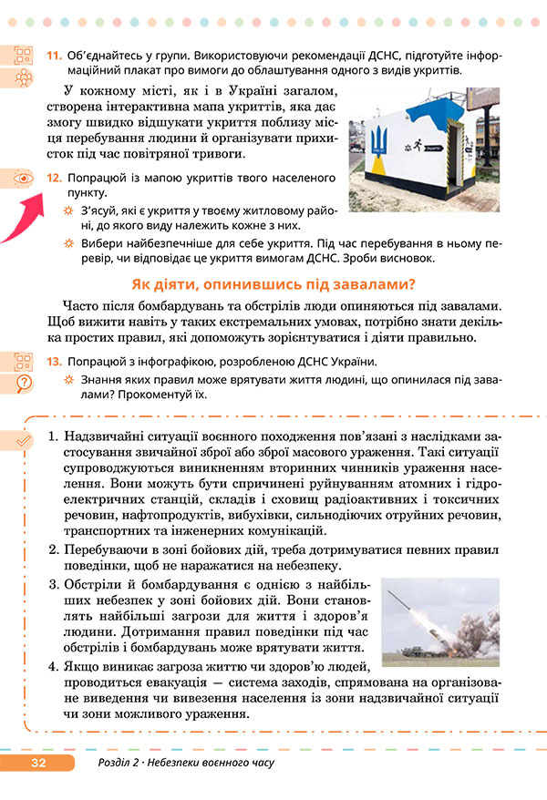— Виконайте завдання 12 на сторінці 32 підручника. Попрацюйте з мапою укриттів вашого населеного пункту.