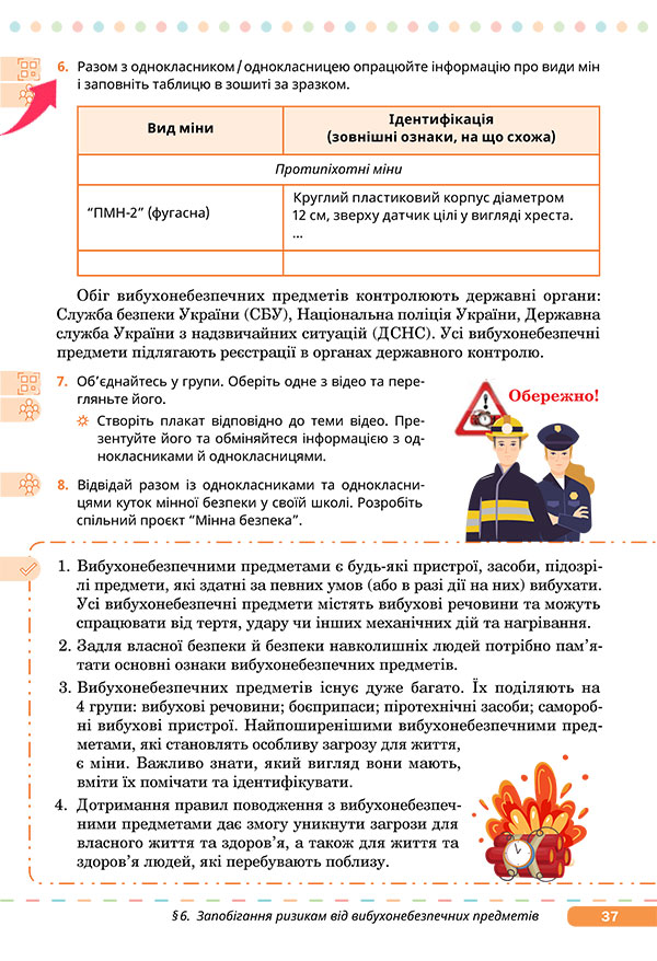 — Перевіримо домашню роботу (завдання 6 на сторінці 37 підручника; робота в групі). Ланцюжком опрацюємо таблицю. Обговоримо особливості кожного виду мін.