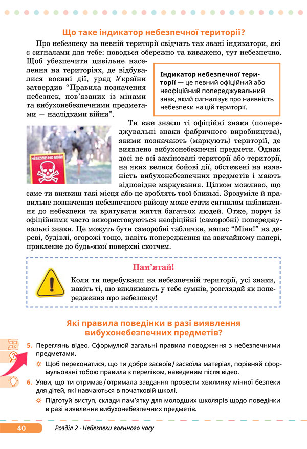 - Зроби висновок: якщо є бодай одна ознака небезпеки, територія вважається небезпечною, туди не можна заходити й потрібно повідомити дорослих або спеціальні служби.