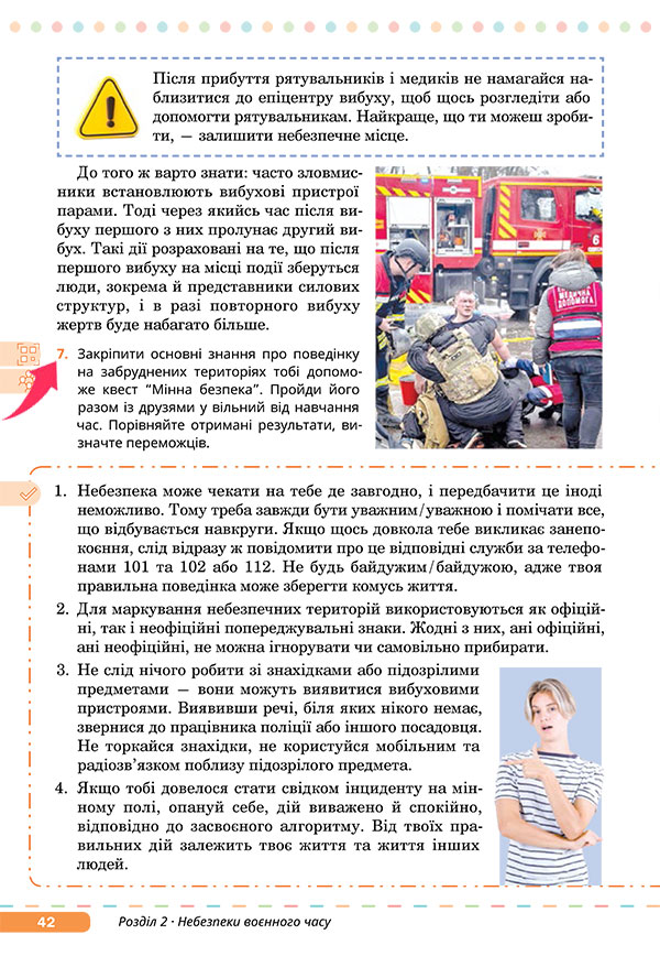 — Виконайте завдання 7 на сторінці 42 підручника. Квест допоможе закріпити основні знання про поведінку на забруднених територіях.
