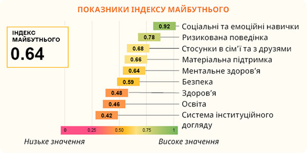 У 2023 р. було проведено пілотне дослідження Індексу майбутнього (Індексу добробуту дітей). Дослідження провели, щоб розкрити різні аспекти, які впливають на добробут дітей в Україні. Кожен показник оцінювали за шкалою від 0 (найнижчий рівень) до 1 (найвищий рівень). За результатами дослідження отримали індекс майбутнього, що дорівнює значенню 0.64. Тобто цей показник є вищим за середній.